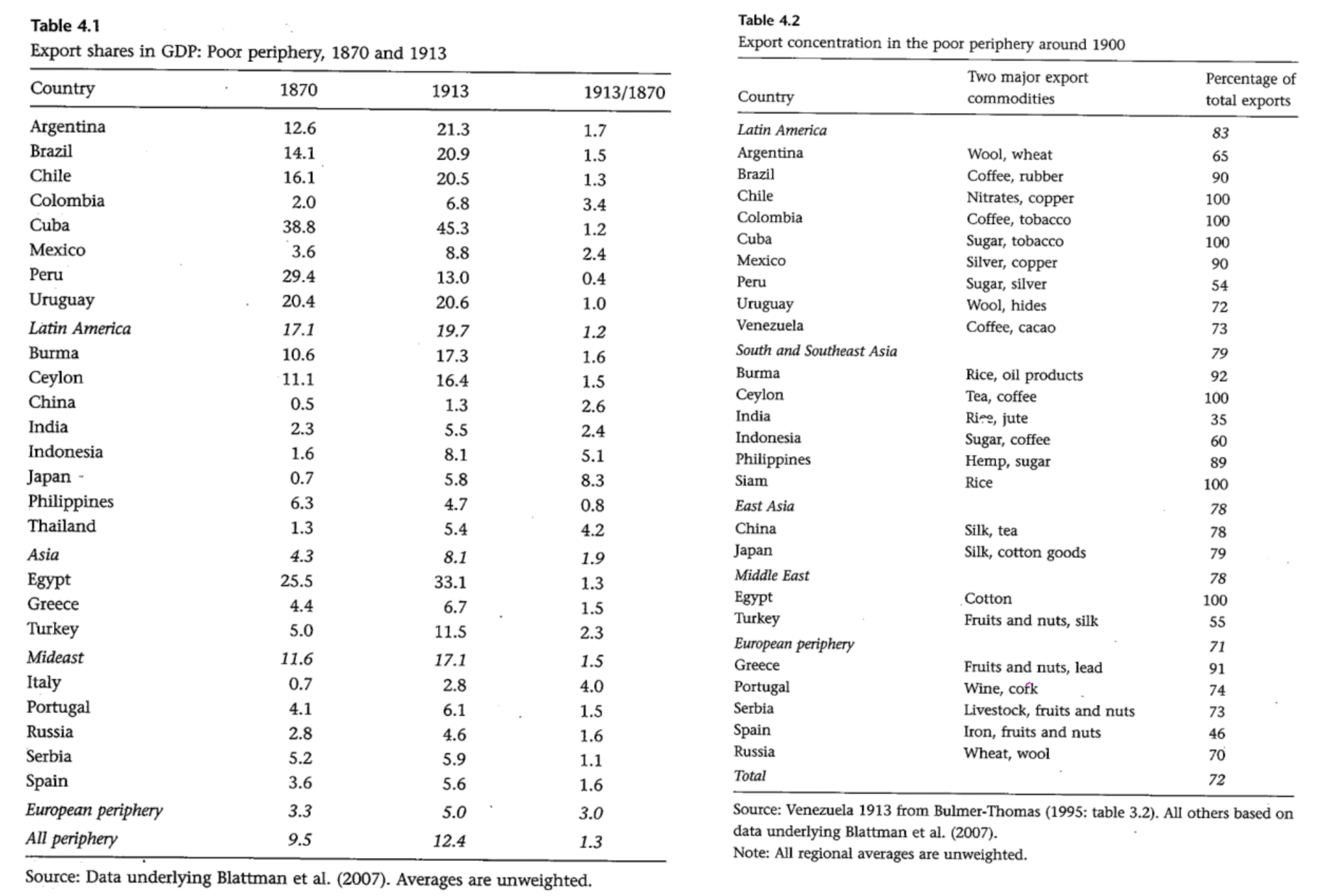 - many peripheral countries dependent on their export (Cuba, Colombia, Chile with 100% of GDP being exports)