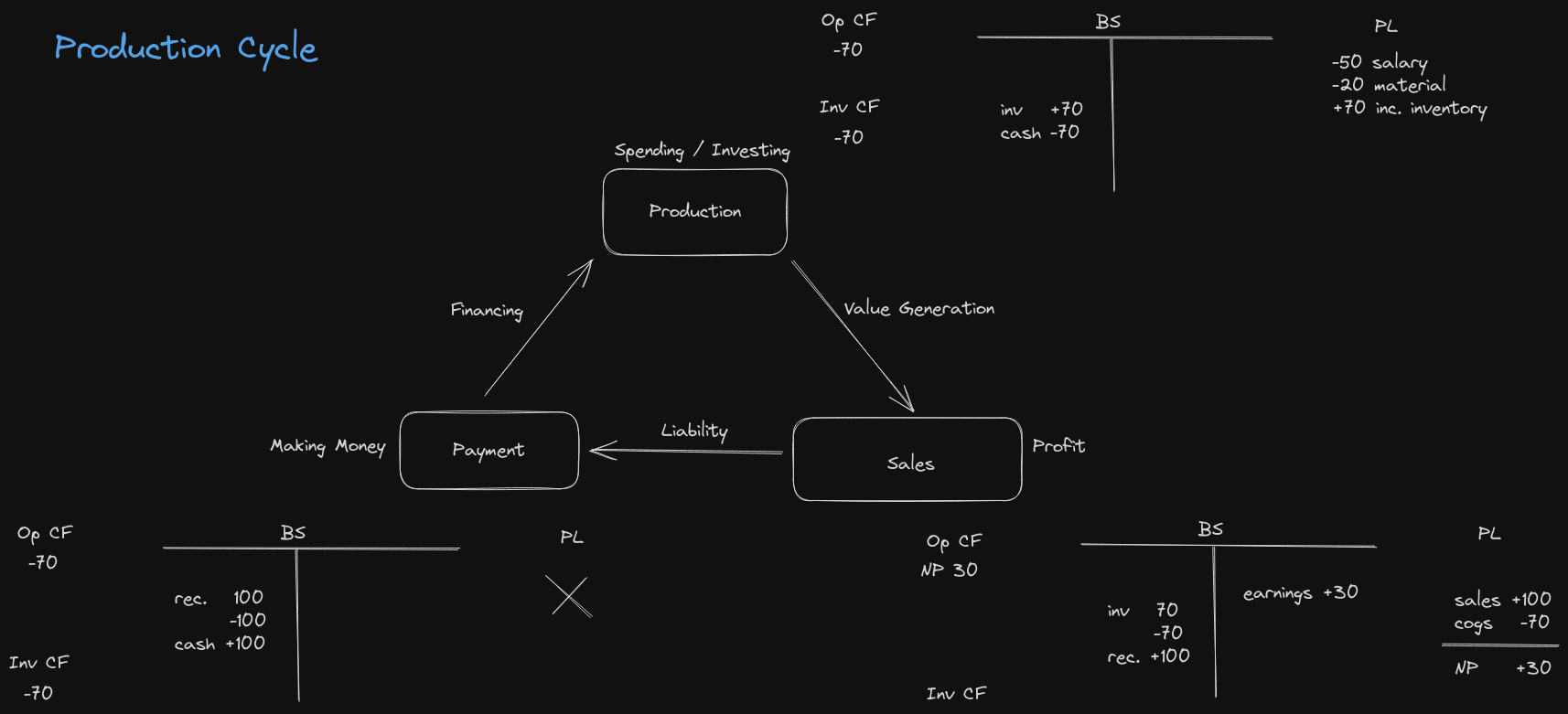 - P/L (Sales +50, Cost of Goods Sold -35 = 15 Profit)
