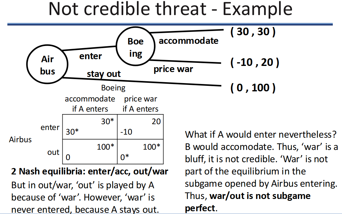 2 Nash Equilibrium (enter/acc, out/war) empty threat of Boing: war Airbus does not enter, no price war necessary