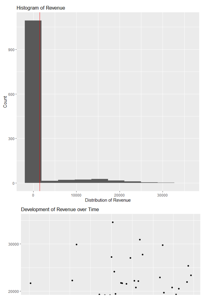 Visualization: First, you look at the following two graphs to explore revenue’s distribution (left graph, red line: mean(revenue)) and development over time (right graph, blue line: revenue ~ time, with 95% error margins). Describe what you see. What does this mean for the management?