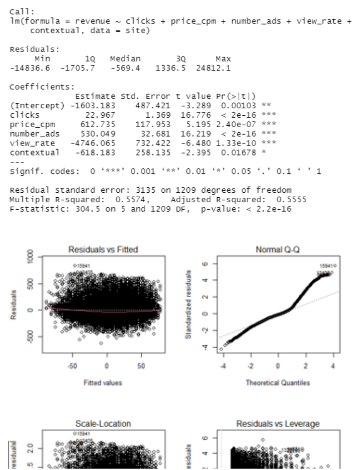 contextualis still significant with p<0.05. 55.74% of the data can be described by the model. However i think the problem of the model is that view rate decreases the revenue which should be otherwise. the same goes with contextually fitting ads